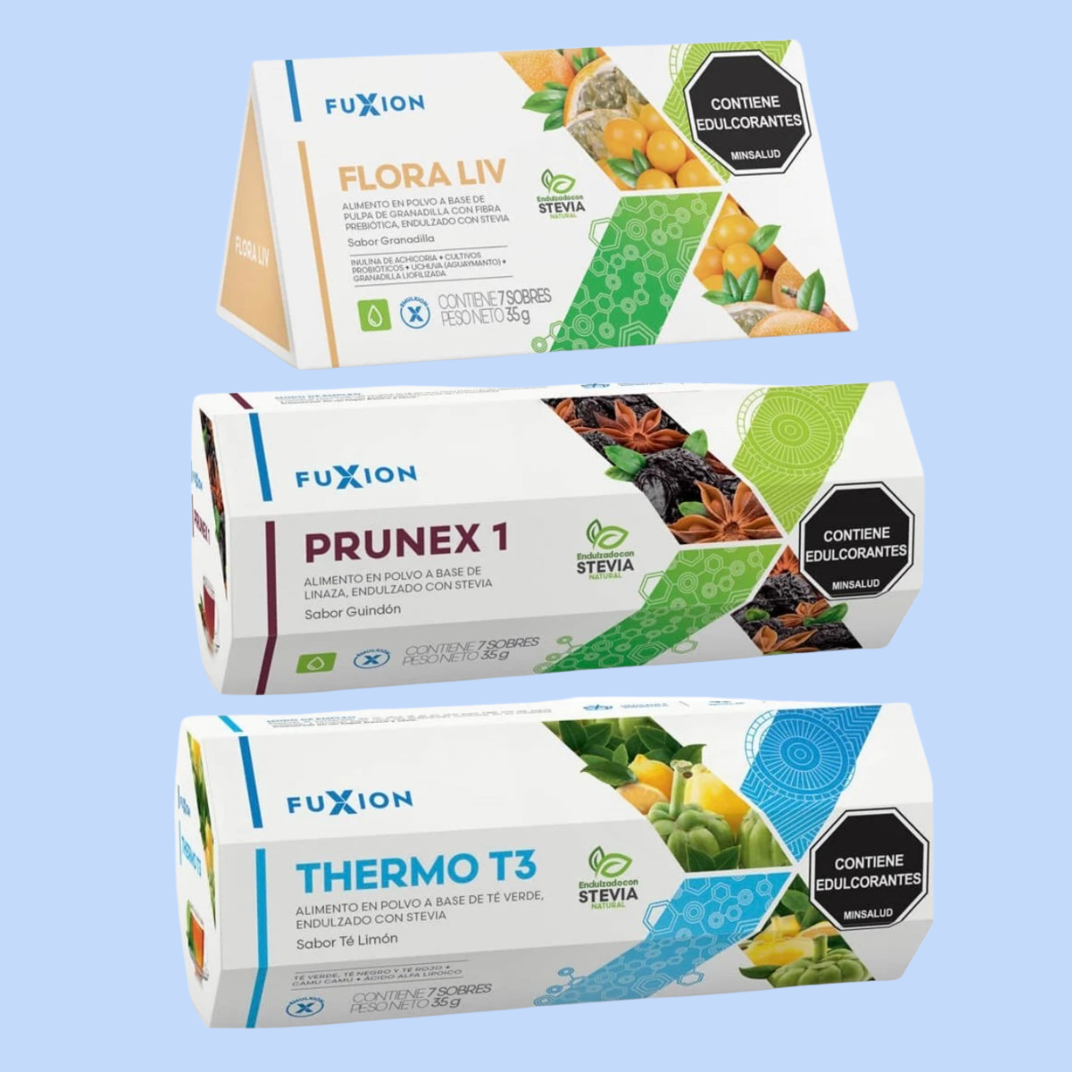 Tratamiento x7 días, empiezas con 1 sobre de Prunex en la noche 30 min antes de ir a la cama, y 1 sobre de Flora Liv en ayunas en agua fría y Después thermo t3 x7 días, 1 sobre en la mañana